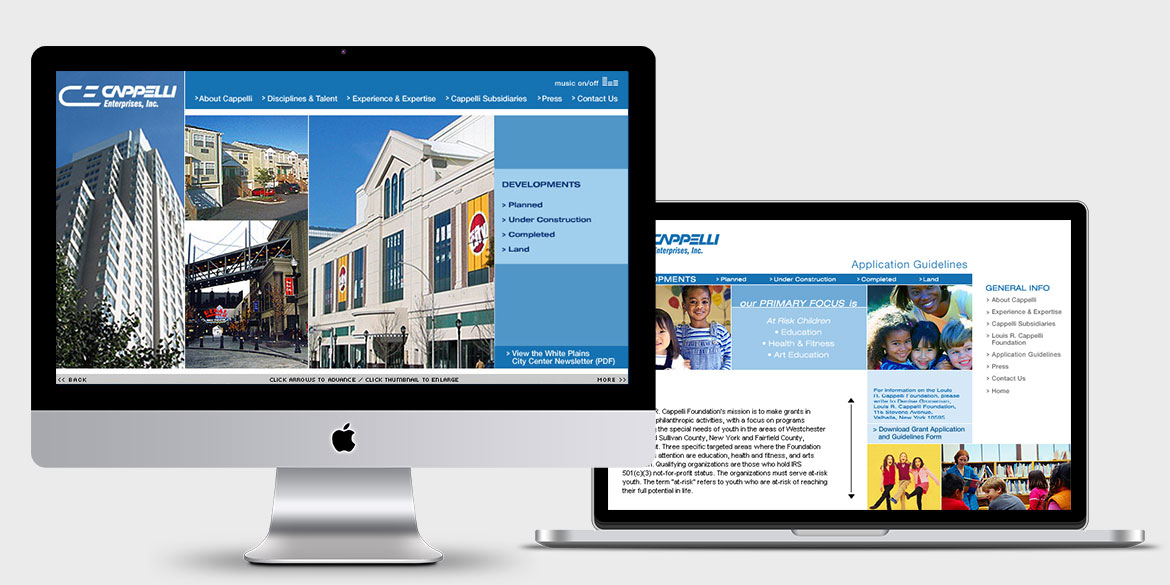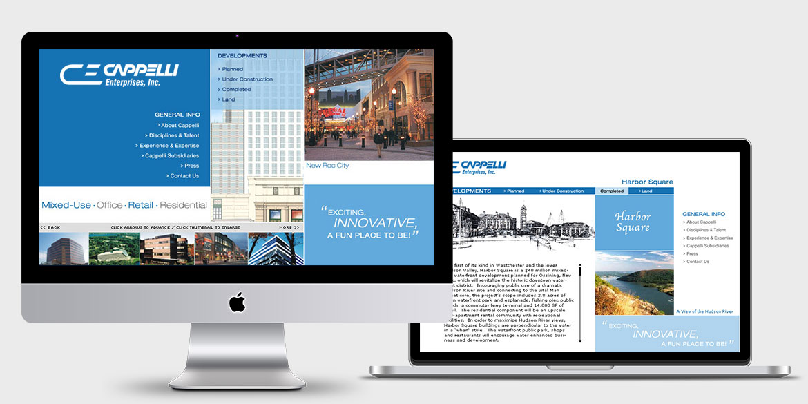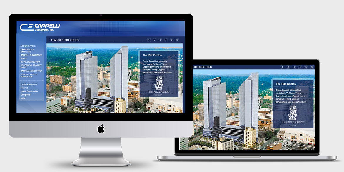 Digital Instincts created a site for the Cappelli Organization which featured robust imagery and information about their many development projects as well as News & Events, Leasing info and content about their contruction companies.