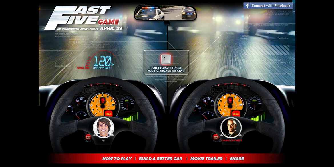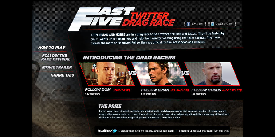 Digital Instincts concepted a twitter game and tablet app for MTV to promote the movie Fast Five. The twitter game was a hashtag race where users could help the characters from the movie, DOM, BRIAN AND HOBBS win a drag race , ultimately to be crowned the best and fastest. They'd be fueled by user's Tweets. Users could join a team and help their character win by tweeting using the team hashtag. The more tweets the more horsepower!