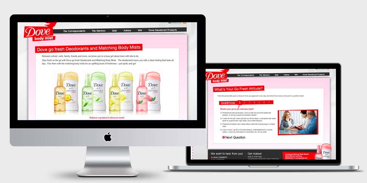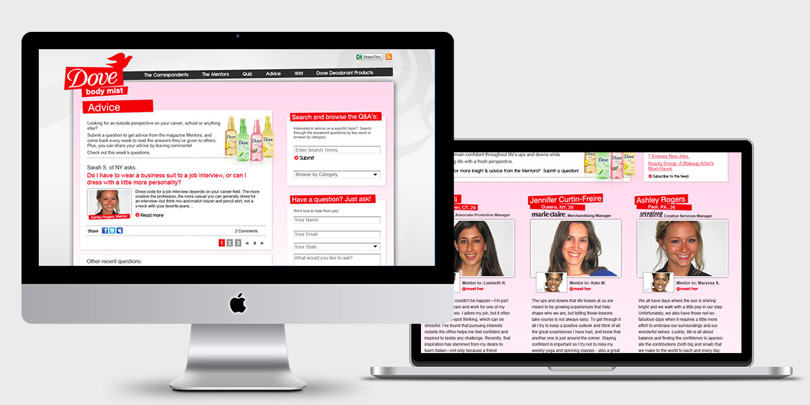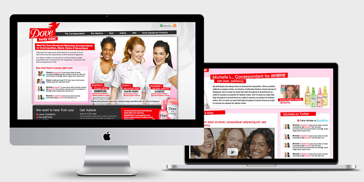 Digital Instincts created a CMS driven blog to host a unique social media-based experience with Dove along with mentors from Hearst's Cosmopolitan, Marie Claire and Seventeen magazines. This site also featured a Sweepstakes to help Dove create buzz about their brand new line of body mists.
