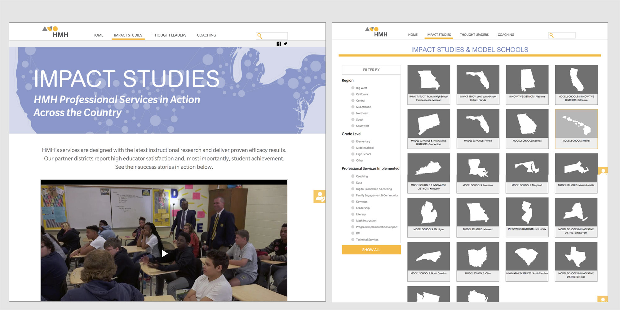 Digital Instincts created a responsive site that promotes HMH's Professional Services with such content as videos, social feeds, new feeds, thought leader bios. A robust Impact Studies section serves to allow filtering of various Success Stories by region, grade level and the services that were implemented. Content can be easily edited in our custom created WordPress templates.