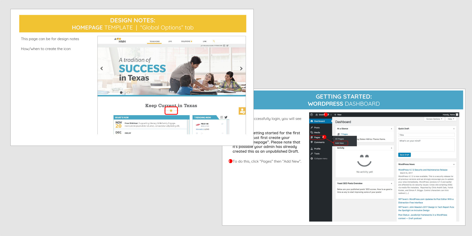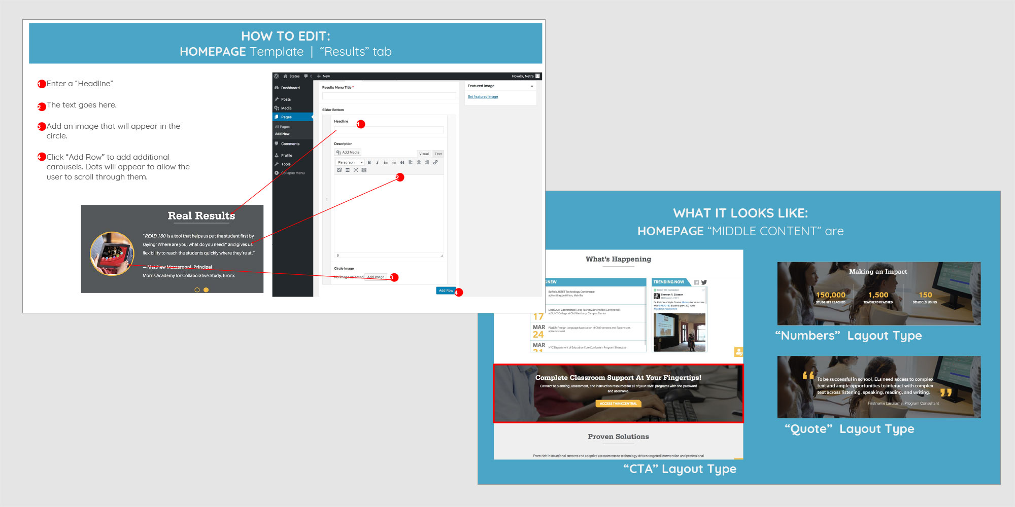 Digital Instincts also created a comprehensive instructional document that was distributed to all marketing teams to visual reference how each updatable area can be managed in WordPress. All with screenshare demos, this document allowed teach in HMH to quickly and efficiently manage these microsites with very little WordPress experience.
