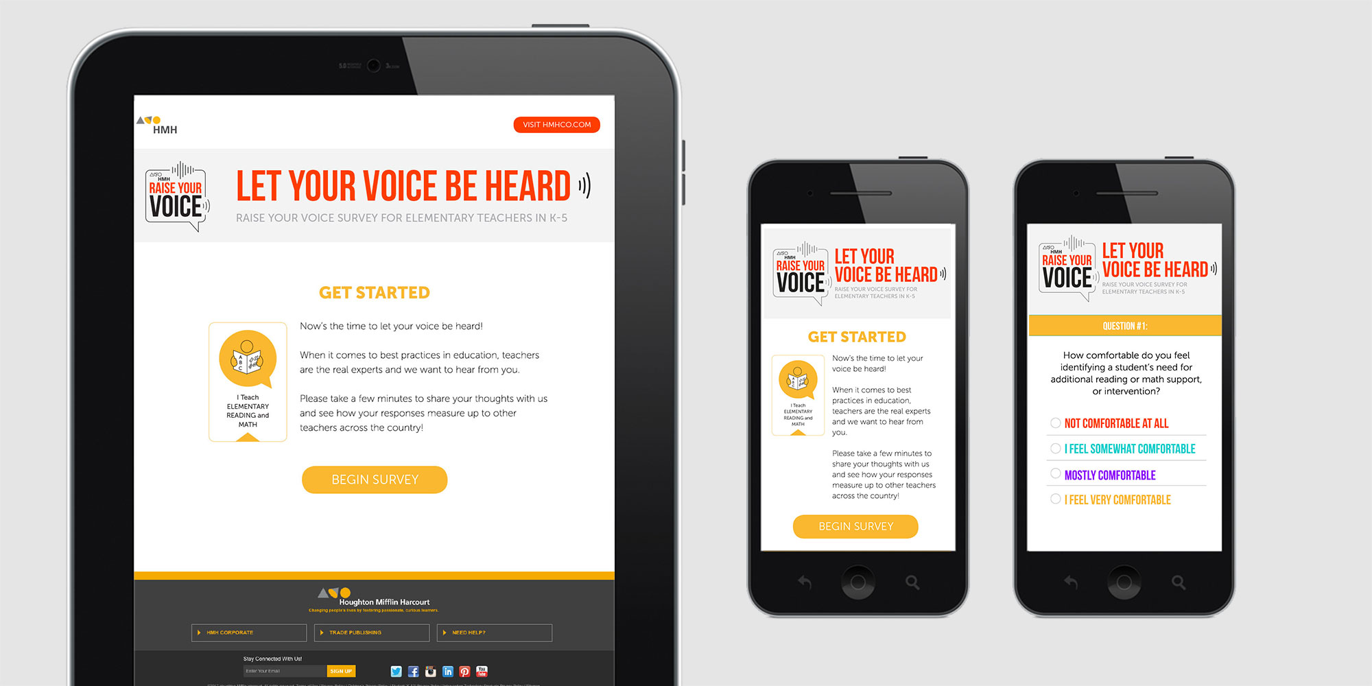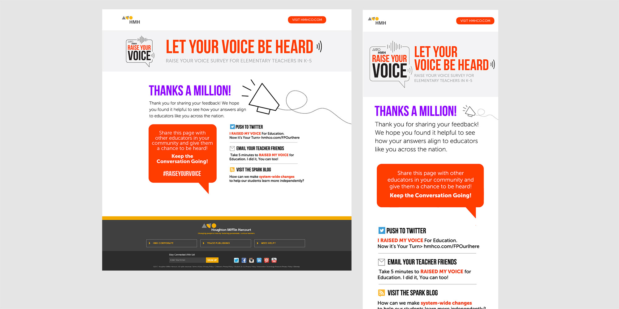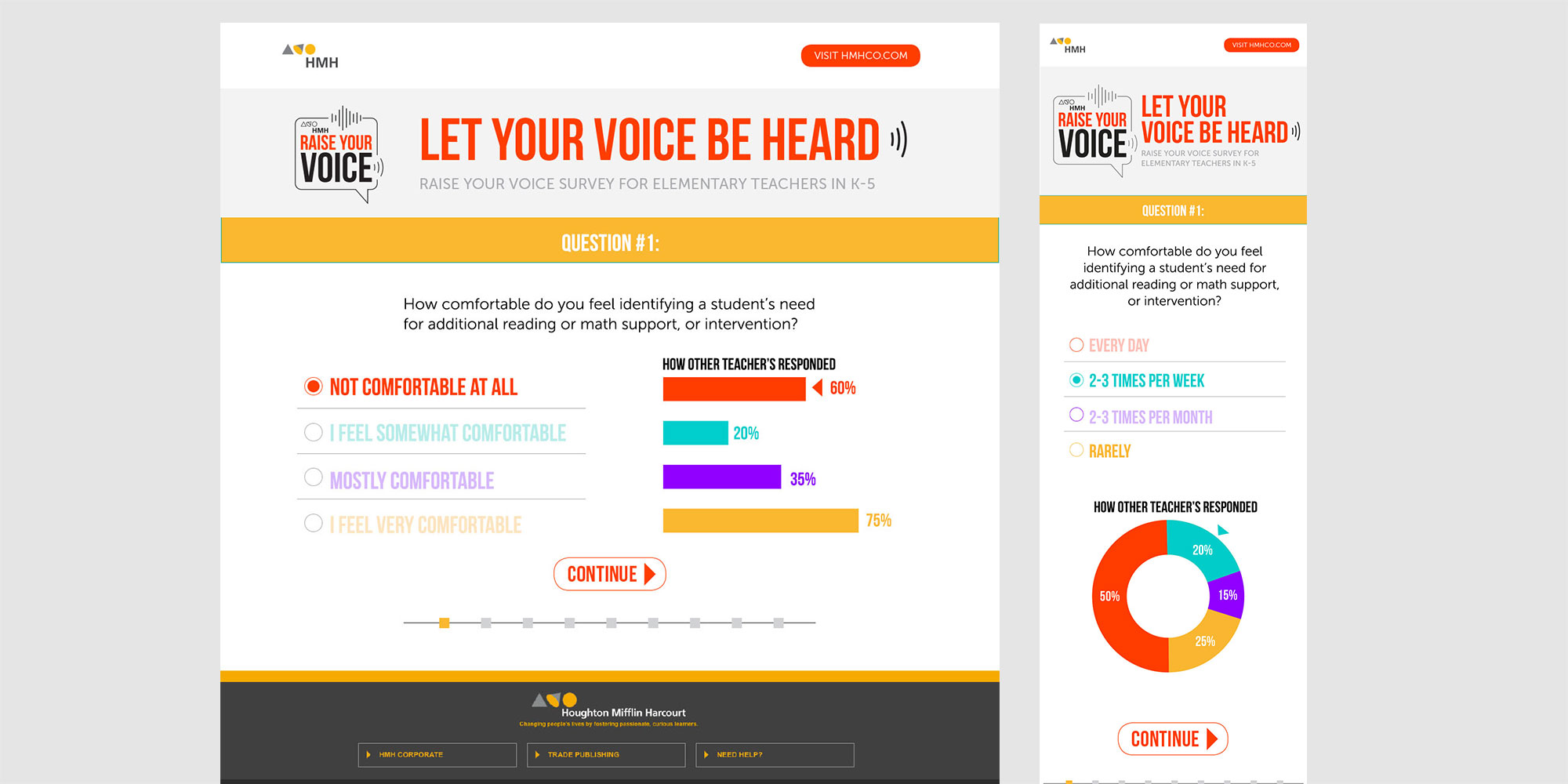 Digital Instincts created a responsive tool using WordPress to allow admins to quickly create a survey with any topic that they can link to from any of their marketing websites. A simple interface allows this to be created and implemented very quickly and efficiently. HMH teams & users both are provided with live results from each submitted survey in color coded data visualization charts. Data is stored for teams to access anytime, which provides valuable metrics that ultimately allows HMH to connect with their teachers and to improve on programs & processes as a result.