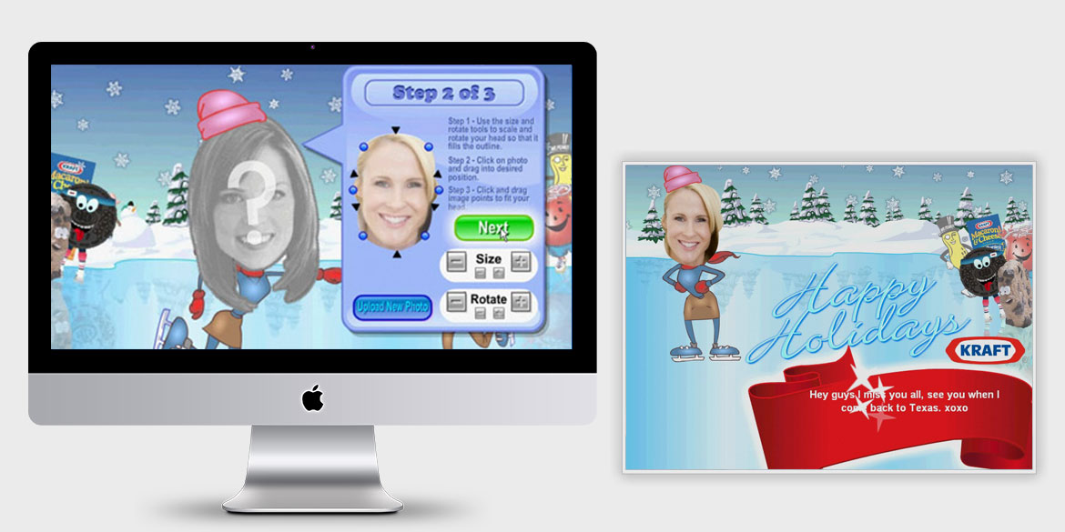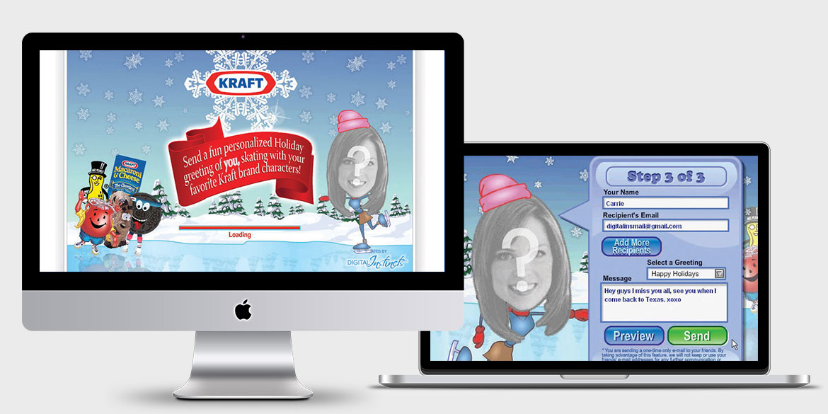 Users arrived at the campaign via TV spots aired on the Food Network, through banner ads on People.com, and Print advertising both in book and at POP. The card featured Digital Instincts custom rendered artwork of skaters and scenery together with animated Kraft characters. A powerful custom backend application allowed users to upload their photos into the scene, tools that allowed image resizing and scaling. Viral pushes included send to friends and email drives.