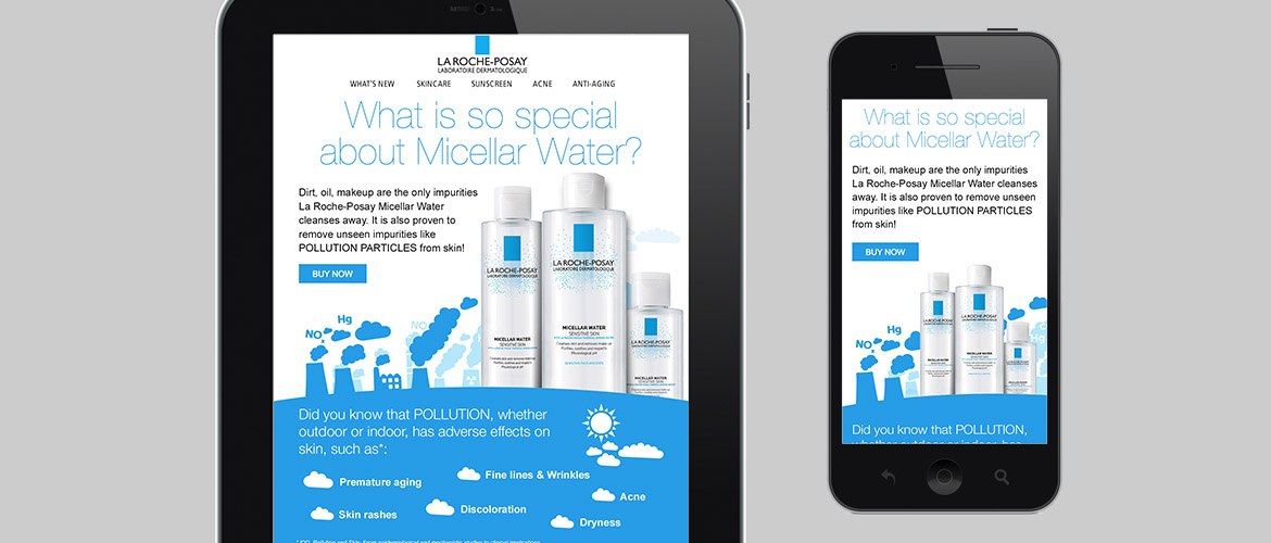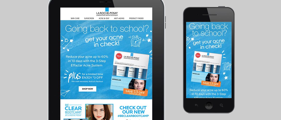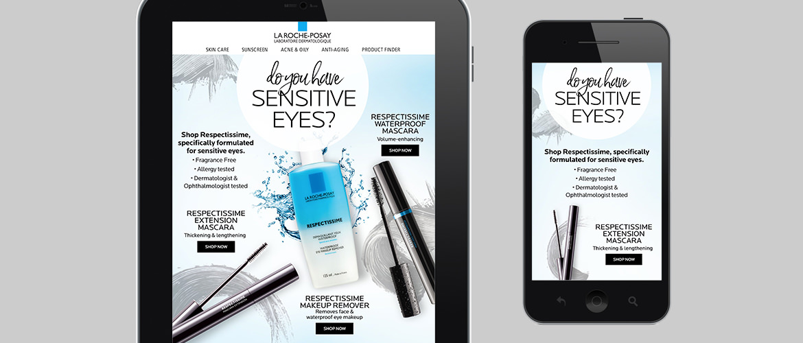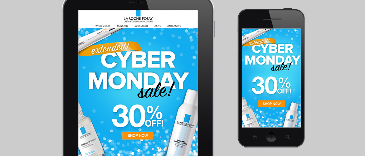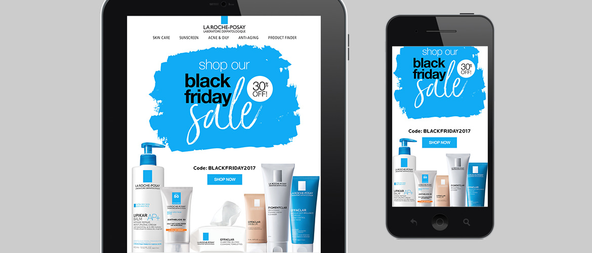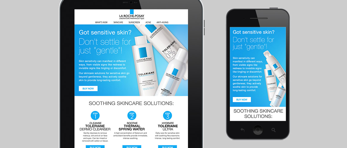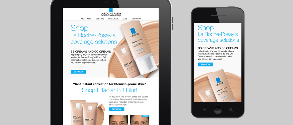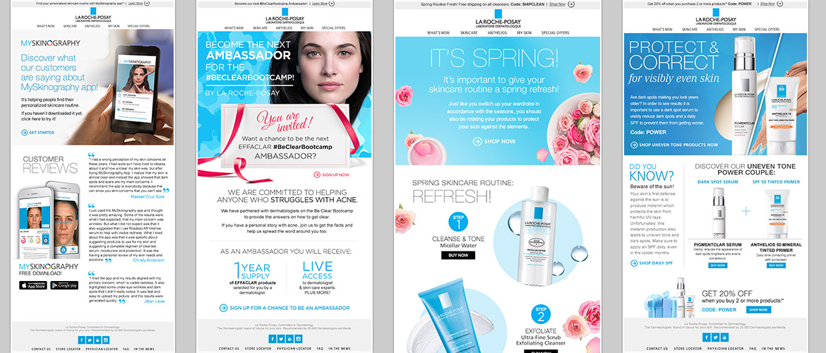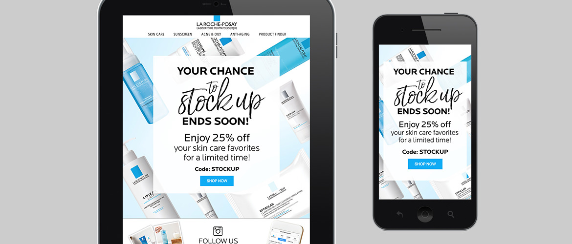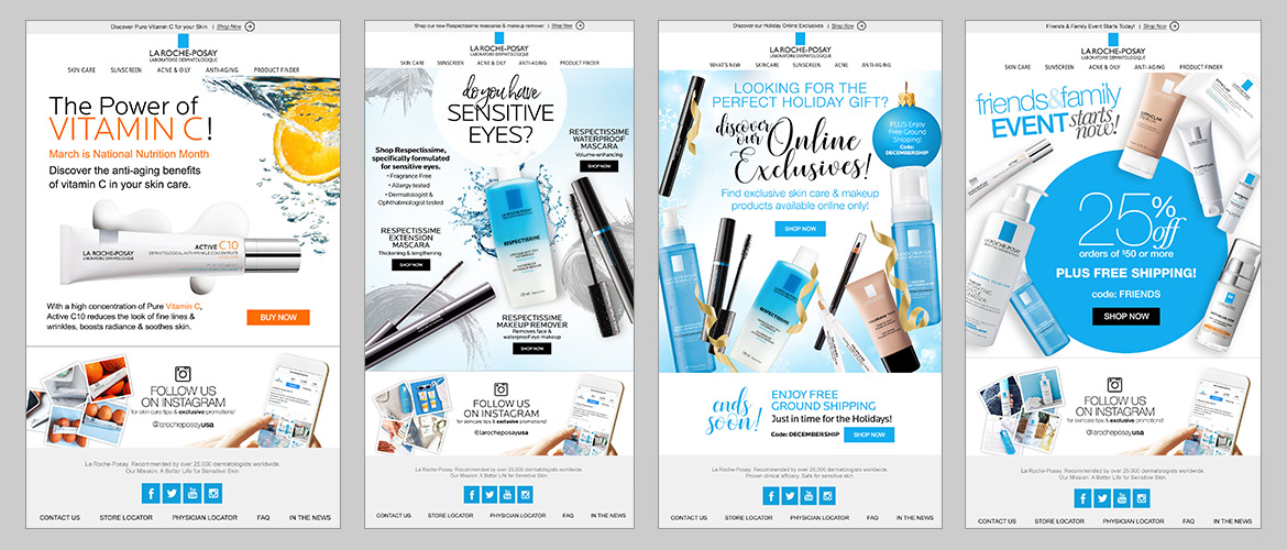 For the past 3 years Digital Instincts has been designing compelling weekly email campaigns for the La Roche-Posay skincare brand. Our email layout models contain a succinct headline, key message product offers with supporting products and visuals to help convince readers on the benefits of clicking-through. Each campaign follows a level of brand standardizations such as consistent logo placement, toolbars, social icons and a combination of web and brand fonts used. All designs reflect a mobile-first design approach that allows for optimal viewing across all platforms. Most campaigns feature either single-column or double column layouts, with clear and concise messaging that places the emphasis on calls-to-action to drive conversions. The designs have consistently proven to effectively provide measured click-throughs and increased product sales.