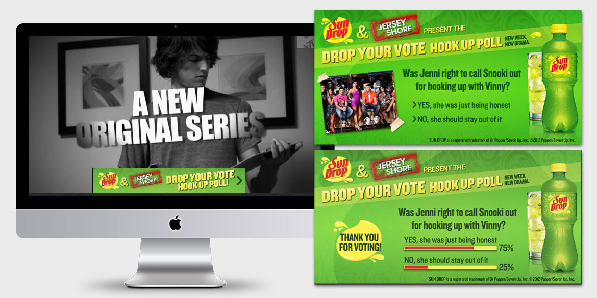 The Challenge Digital Instincts created an interactive banner played during episodes of Jersey Shore on mtv.com. Clicking the unit launches a full-sized poll with live results, co-branded with SunDrop soda.