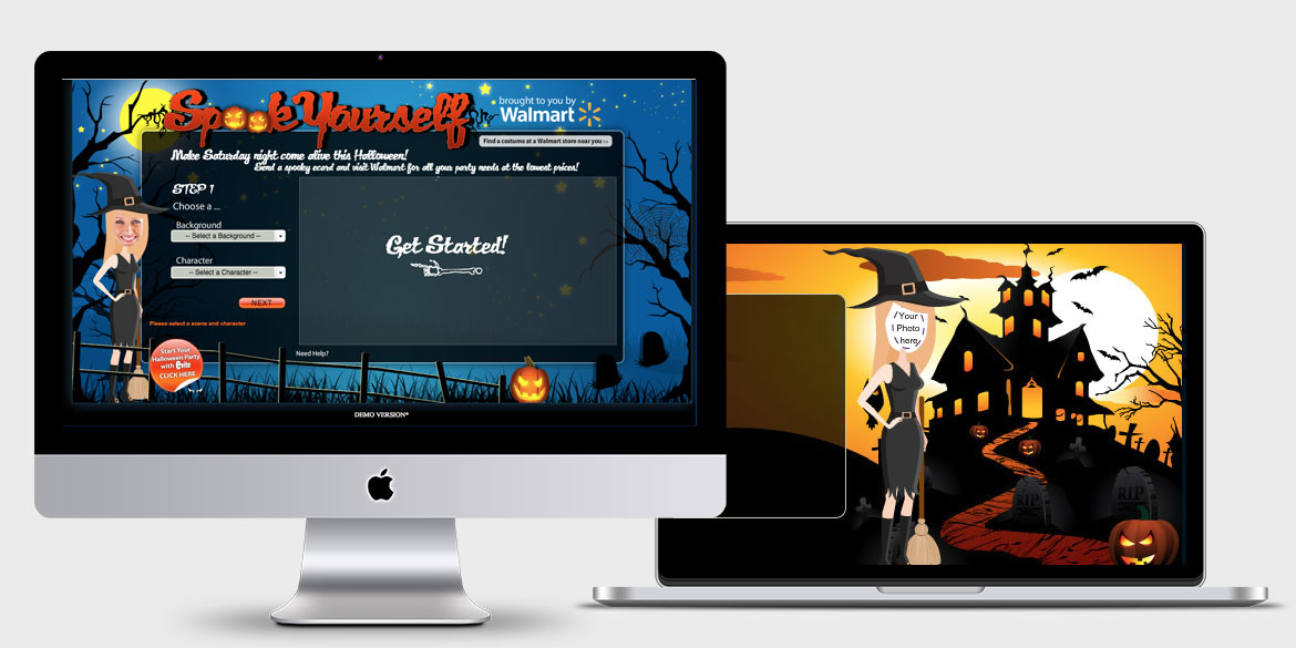 A collaboration between IAC e-card, Wal-Mart and Digital Instincts. User can send a spooky card starring themselves. An intuitive interface powers this fun and engaging website that features easy steps to selecting a background, a character and a customized greeting card message.